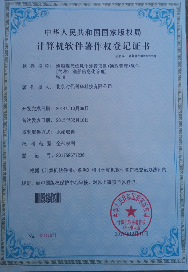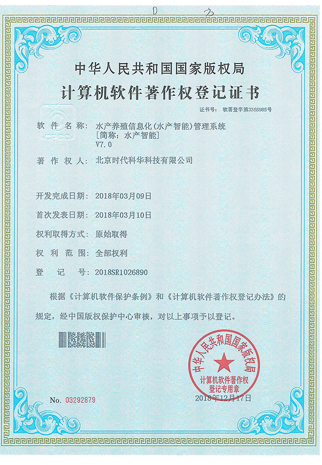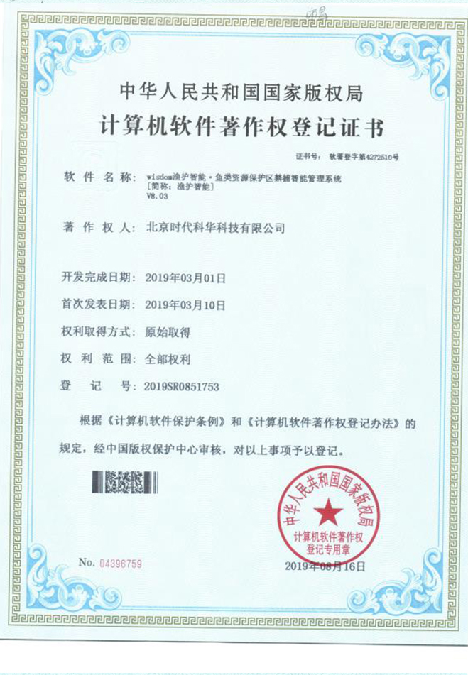 公司始终如一的贯彻国际质量管理体系,通过ISO9001质量管理体系认证、ISO14001环境管理体系认证、ISO45001职业健康安全管理体系认证、北京市高新技术企业、AAA级信用企业认证、企业纳税信用等级A级企业,自主知识产权有水产养殖管理系统、渔船现代信息化管理系统、wisodm渔护智能管理系统、农业环境监测等专利及软件著作权。